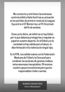 “Me consterna y entristece las amenazas contra la árbitra Katia Itzel tras su actuación en los partidos de primera ronda de la Leagues Cup. Como ya he dicho: sin árbitros no hay futbol. Debemos protegerlos y respetar su papel en nuestro deporte. En el futbol y en la sociedad no hay cabida para el abuso, la discriminación ni la violencia de ningún tipo”, escribió Infantino en su cuenta oficial de Instagram.