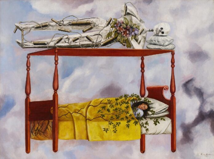 El Sueño (La cama), pintado en 1940, refleja un periodo turbulento en la vida de Kahlo marcado por su compleja relación con Diego Rivera y su deteriorada salud. La obra muestra a la artista dormida sobre una cama colonial cubierta por una manta dorada con enredaderas, mientras un esqueleto tamaño natural —envuelto en dinamita y flores— descansa sobre los postes de madera. Esta composición desafía la lógica espacial y mezcla vida, muerte y misticismo en un solo plano visual.