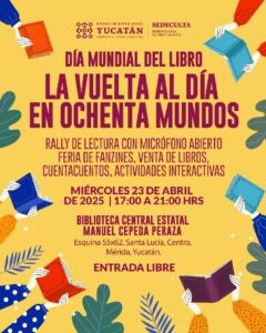 En la Biblioteca Central Manuel Cepeda Peraza de Mérida, Sedeculta Yucatán organiza de 17:00 a 21:00 horas el Rally de Lectura, donde cualquier persona puede leer durante un máximo de 10 minutos un fragmento de su libro. Si no lleva uno, puede solicitarlo en el lugar. Además, habrá: