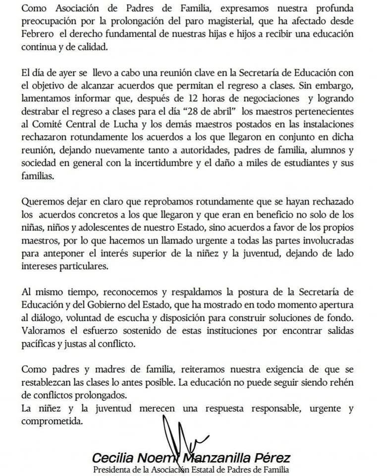 Algunos padres han dirigido sus mensajes a la gobernadora Mara Lezama, solicitando su intervención directa, mientras que otros se han volcado a las redes del Comité Central de Lucha para pedir que el paro no impida el cumplimiento del calendario escolar, e incluso proponen que los maestros continúen su protesta sin suspender clases, como ocurre en algunas universidades.
