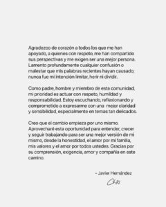 En su mensaje, Hernández indicó que está consciente del impacto de sus palabras: “Como padre, hombre y miembro de esta comunidad, mi prioridad es actuar con respeto, humildad y responsabilidad. Estoy escuchando, reflexionando y comprometido a expresarme con una mejor claridad y sensibilidad, especialmente en temas tan delicados”.