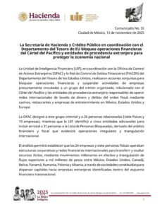 Mientras tanto, el gobierno estadounidense continúa con una política más agresiva contra el narcotráfico desde el regreso del presidente Donald Trump a la Casa Blanca. Washington designó a los cárteles de Sinaloa y Jalisco Nueva Generación como organizaciones terroristas extranjeras y reforzó operativos militares contra embarcaciones usadas para transportar droga en el Pacífico y el Caribe. Este entorno internacional incrementa la presión sobre México para atender rutas financieras del crimen organizado.