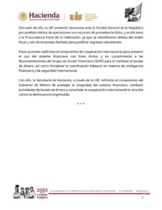 En su comunicado, Hacienda insistió en que México mantiene compromisos internacionales para prevenir el uso del sistema financiero con fines ilícitos y cumplir estándares marcados por el GAFI. El fortalecimiento de este cerco responde al incremento de esquemas sofisticados que mezclan flujos legales con dinero ilícito mediante redes empresariales y estructuras transnacionales.