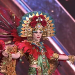 “El trabajo artesanal es lo que cuenta muchísimo… es detallar cada pieza del traje, la pedrería y que la modelo pueda reflejar los colores sobre todo”, explicó Ortiz, destacando la orientación cultural y espiritual que guiaron la creación del atuendo junto con Fátima Bosch.