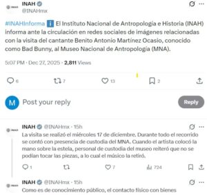 La visita del artista ocurrió el miércoles 17 de diciembre, en el marco de su estancia en México tras concluir su gira “Debí tirar más fotos”. A través de redes sociales, Bad Bunny compartió distintos momentos de su recorrido cultural por la capital del país, incluyendo visitas a funciones de lucha libre, la Casa Azul de Frida Kahlo y el propio museo de Antropología. Fue precisamente una fotografía difundida en Instagram la que detonó la polémica, al mostrar al músico colocando la mano sobre una estela que no cuenta con vitrina de protección.