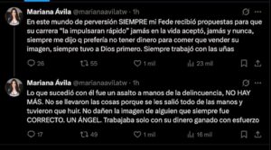 En otro mensaje, Ávila recordó la integridad del cantante y su fe inquebrantable. “En este mundo de perversión, mi Fede siempre recibió propuestas para que su carrera ‘la impulsaran rápido’, jamás aceptó. Siempre me dijo que prefería no tener dinero para comer que vender su imagen. Siempre tuvo a Dios primero. Siempre trabajó con las uñas”, escribió la actriz, visiblemente afectada.