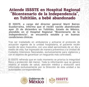 Un recién nacido fue abandonado la noche del 25 de diciembre frente a una iglesia del municipio de Tultitlán, Estado de México, hecho que movilizó a cuerpos de emergencia y autoridades municipales en plena celebración navideña. El menor fue localizado con vida y en condición estable, por lo que fue trasladado a un hospital, mientras la Fiscalía mexiquense abrió una investigación para esclarecer las circunstancias del abandono.