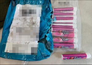 Dentro del paquete se localizó una bolsa plástica azul que contenía 10 recipientes cilíndricos color blanco con rosa, todos etiquetados con la leyenda «Gelato Cake», una marca comúnmente asociada con productos elaborados a base de cannabis. Aunque el etiquetado aparentaba ser comercial, el empaque y el contenido generaron sospechas de que se trataba de una sustancia prohibida.