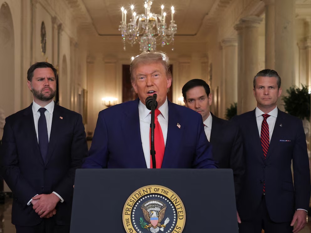 Rodeado de su vicepresidente JD Vance, el secretario de Estado Marco Rubio y el secretario de Defensa Pete Hegseth, el presidente Donald Trump ofreció un mensaje de poco más de tres minutos desde la Casa Blanca para confirmar que las fuerzas armadas de Estados Unidos destruyeron “completamente” tres instalaciones nucleares clave del régimen iraní: Fordow, Natanz e Isfahán.