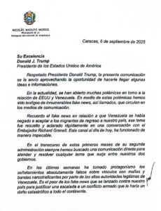 En un intento por frenar la creciente presión internacional, el dictador Nicolás Maduro difundió este domingo una carta dirigida al presidente de Estados Unidos, Donald Trump, donde niega categóricamente cualquier vínculo con el narcotráfico, denuncia la existencia de “fake news” en su contra y propone abrir un canal de negociación a través del exembajador Richard Grenell. La misiva, fechada el 6 de septiembre, aparece justo después de la ofensiva militar estadounidense en el Caribe, donde ya han sido interceptadas varias embarcaciones vinculadas al trasiego de drogas y presuntamente relacionadas con Venezuela.