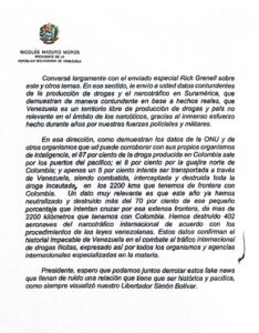 El documento, publicado por el régimen chavista y entregado mediante un “intermediario suramericano”, llega en un contexto en el que Washington ha intensificado su presión política, financiera y militar contra Caracas. Apenas cuatro días antes de la carta, un ataque de fuerzas estadounidenses contra una lancha sospechosa dejó 11 muertos y encendió las alarmas sobre el rol de Venezuela como corredor clave del narcotráfico regional.