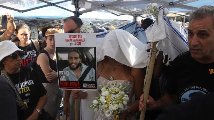 Ilana Gritzewsky, mexicana liberada en 2023 tras ser rehén de Hamas, protagonizó una emotiva ceremonia simbólica en Tel Aviv este domingo. Vestida de blanco, la joven selló con lágrimas y promesas de esperanza su unión con su novio, Matan Zangauker, quien permanece secuestrado en Gaza desde hace casi dos años. El acto se desarrolló en la llamada Plaza de los Rehenes, epicentro de las protestas para exigir la liberación de los cautivos.