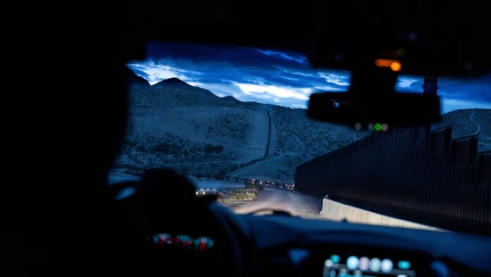 En el interior de un vehículo blindado, un explorador del ejército utiliza un joystick para dirigir un visor óptico de largo alcance hacia un hombre encaramado en la cima de la cerca que separa la frontera entre Estados Unidos y México, que atraviesa las colinas de esta comunidad en Arizona.