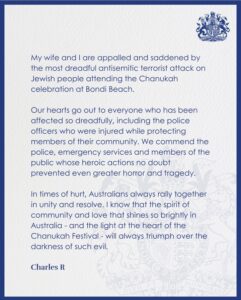 En su pronunciamiento oficial, el rey Carlos y la reina Camila expresaron consternación y tristeza por lo ocurrido. El mensaje destacó la naturaleza antisemita del atentado y reconoció la labor de los cuerpos de emergencia y de ciudadanos que intervinieron para evitar una tragedia aún mayor.
