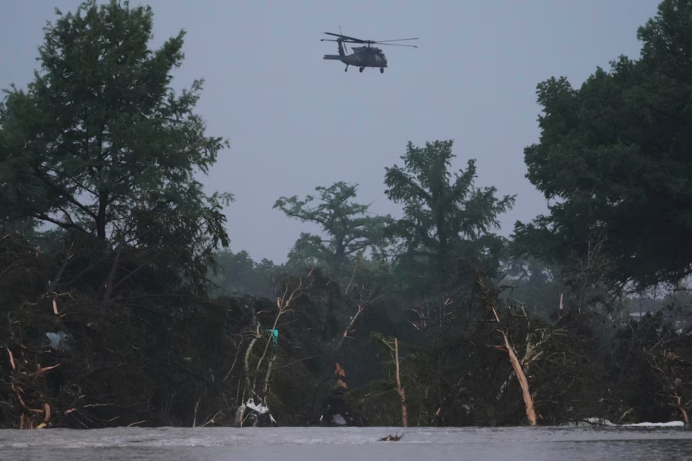 Helicópteros y voluntarios participan en las labores de búsqueda en la zona de desastre, particularmente alrededor del Camp Mystic, donde aún no se ha localizado a 10 niñas y un consejero. Las operaciones se han dificultado por los escombros acumulados en caminos y puentes.