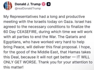 “MIS REPRESENTANTES MANTUVIERON HOY UNA LARGA Y PRODUCTIVA REUNIÓN CON LOS ISRAELÍES SOBRE GAZA. ISRAEL HA ACORDADO LAS CONDICIONES NECESARIAS PARA FINALIZAR EL ALTO EL FUEGO DE 60 DÍAS, DURANTE EL CUAL TRABAJAREMOS CON TODAS LAS PARTES PARA PONER FIN A LA GUERRA”.