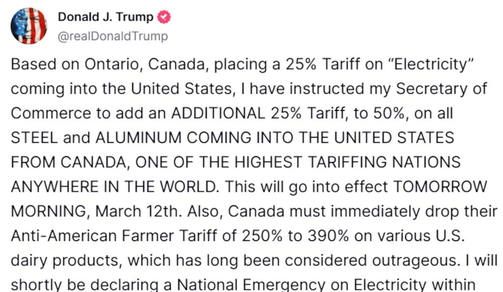 Trump comunicó la decisión a través de su red Truth Social, donde escribió: «Esto entrará en vigencia MAÑANA POR LA MAÑANA, 12 de marzo». El nuevo arancel duplica la tasa original del 25% que habría entrado en vigor poco después de la medianoche.