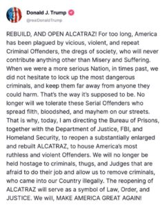 Donald Trump volvió a sacudir la opinión pública este domingo al anunciar, a través de Truth Social, la reapertura de la célebre prisión de Alcatraz. El mandatario ordenó la remodelación del complejo ubicado en una isla frente a San Francisco, con el fin de albergar a los «delincuentes más violentos y reincidentes» del país.