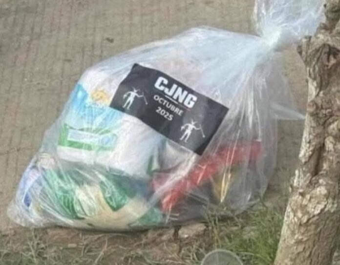 Las bolsas entregadas son transparentes y muestran una etiqueta negra con la leyenda “CJNG Octubre 2025” y figuras de diablos con tridente. Contienen productos como papel higiénico, azúcar y alimentos enlatados. En el fondo de la escena, se observa propaganda política de Movimiento Ciudadano correspondiente a las elecciones del 1 de julio de 2024, lo que confirma que el video es reciente.