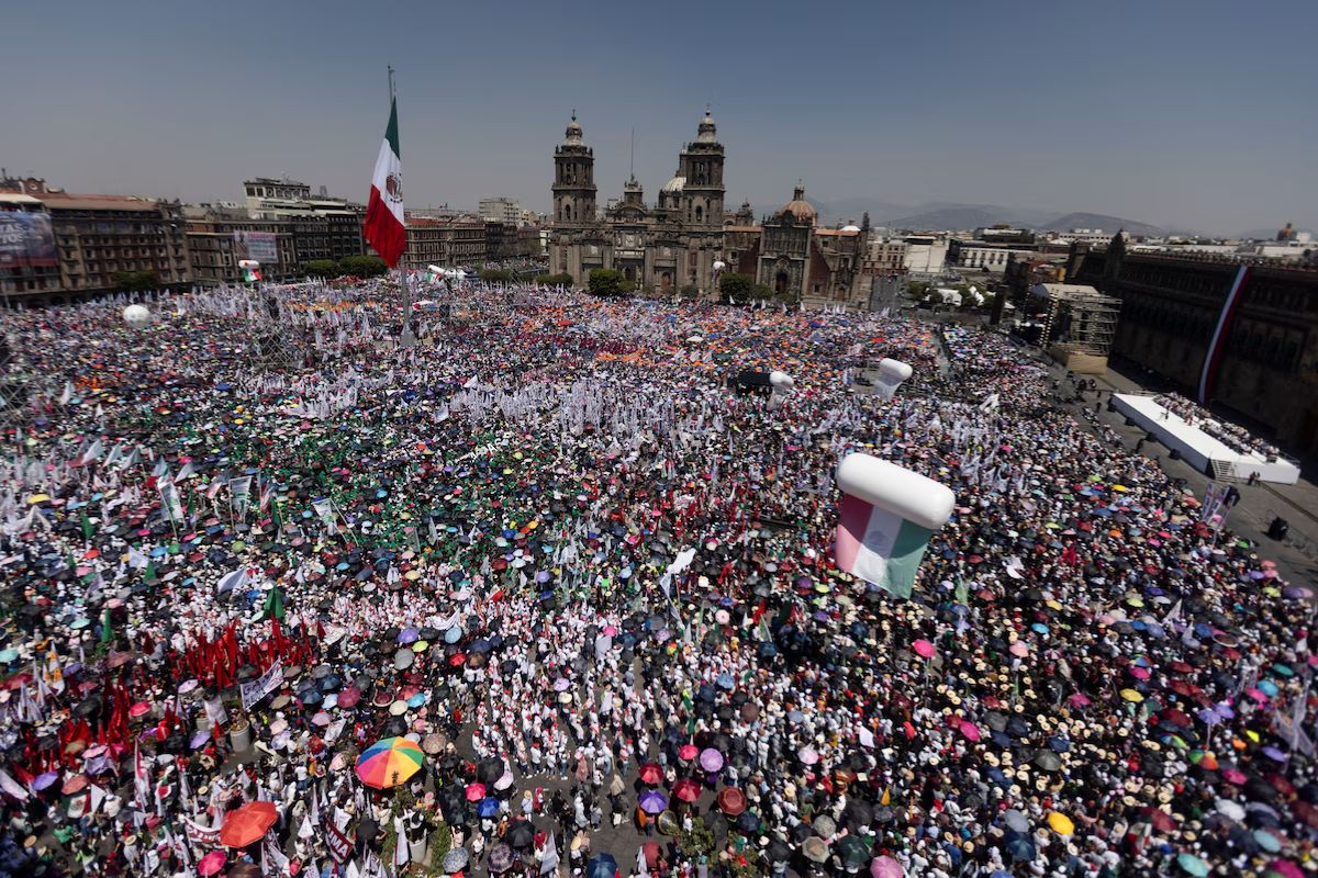 La Asamblea Informativa convocó a miles de personas en el Zócalo capitalino, incluyendo gobernadores, funcionarios y militantes de Morena. Durante su discurso, los asistentes expresaron su apoyo con la consigna «¡No estás sola!», en un gesto de respaldo a la presidenta.