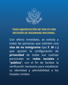De acuerdo con un aviso difundido por la sede diplomática, los solicitantes de visas tipo F (estudios académicos), M (programas técnicos o vocacionales) y J (intercambio) deberán ajustar la privacidad de sus cuentas en plataformas como Facebook, Instagram, X (antes Twitter) y TikTok a modo “público” para poder ser considerados admisibles.