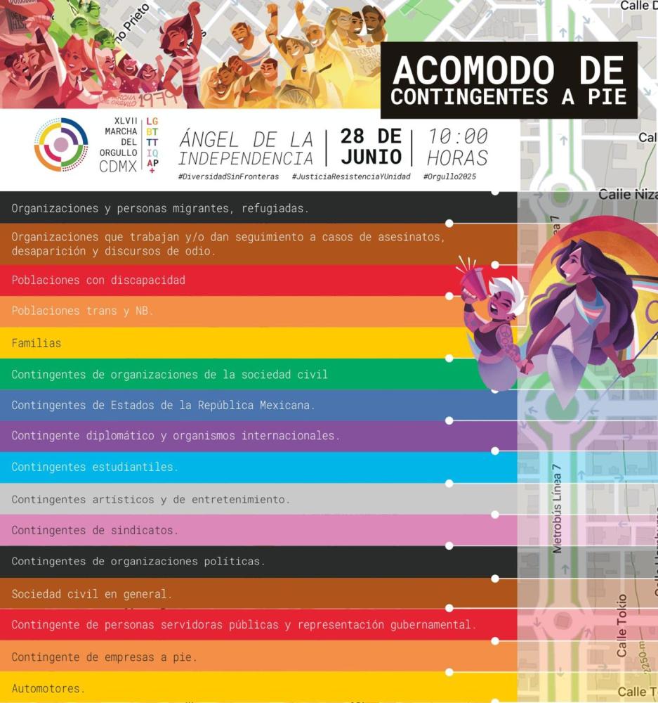 Este sábado 28 de junio se celebrará en la capital del país la XLVII Marcha del Orgullo LGBT+ CDMX, una de las más multitudinarias y emblemáticas de América Latina, que este año se realiza bajo el lema: “Diversidad sin fronteras. ¡Justicia, Resistencia y Unidad!”. La consigna resalta el apoyo a personas en movilidad humana y a las víctimas de discursos y políticas antiderechos en todo el mundo.