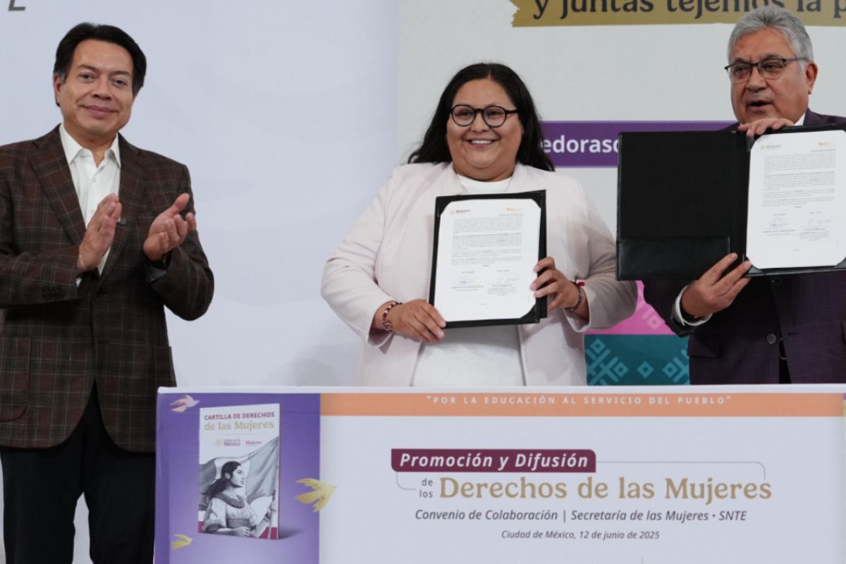 En un acto que marca un antes y un después para el Sistema Educativo Nacional, el secretario de Educación Pública, Mario Delgado Carrillo, participó como testigo de honor en la firma del convenio de colaboración entre la Secretaría de las Mujeres y el Sindicato Nacional de Trabajadores de la Educación (SNTE), con el objetivo de promover y garantizar los derechos de niñas, adolescentes, jóvenes y mujeres en el entorno escolar.