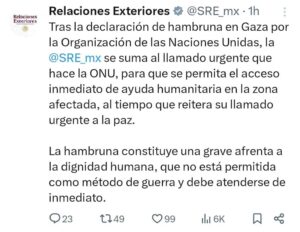 En un comunicado difundido en su cuenta oficial de X, la SRE subrayó el compromiso del gobierno mexicano con la paz y la asistencia humanitaria internacional, sumándose a la exigencia global de garantizar la entrada segura de alimentos, medicinas y suministros esenciales a las zonas más afectadas por el conflicto.
