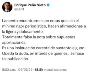 Peña Nieto no solo rechazó las imputaciones, sino que cuestionó la intención detrás de la publicación. «Lamento encontrarme con notas que, sin el mínimo rigor periodístico, hacen afirmaciones a la ligera y dolosamente… Queda la duda, en interés de quiénes se hace tal publicación», escribió desde su cuenta en la red social X (antes Twitter).