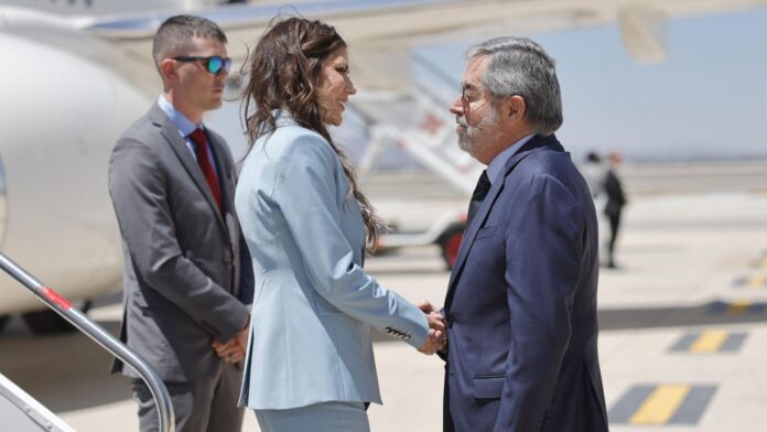 Noem aterrizó en el Aeropuerto Internacional Felipe Ángeles al mediodía, procedente de Colombia. Fue recibida por el secretario de Relaciones Exteriores, Juan Ramón de la Fuente, y posteriormente llegó a Palacio Nacional en una comitiva de vehículos blindados.
