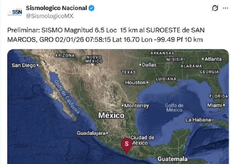 Un sismo de magnitud preliminar 6.5, con epicentro en el estado de Guerrero, se registró la mañana de este viernes 2 de enero y fue percibido con intensidad en diversas regiones del país, incluida la Ciudad de México. El movimiento telúrico ocurrió a las 7:58 horas, a 15 kilómetros al suroeste de San Marcos, según el reporte inicial del Servicio Sismológico Nacional (SSN). Hasta el momento, las autoridades federales y estatales no han confirmado víctimas mortales ni daños estructurales graves, aunque continúan las evaluaciones en las zonas cercanas al epicentro.