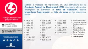 El aviso también incluye a zonas como Moon Palace, Zona Turística, Central de Abastos, Bonfil Doctores, Poblado Bonfil, Condominios Punta Sam, Playa Mujeres e Isla Mujeres.