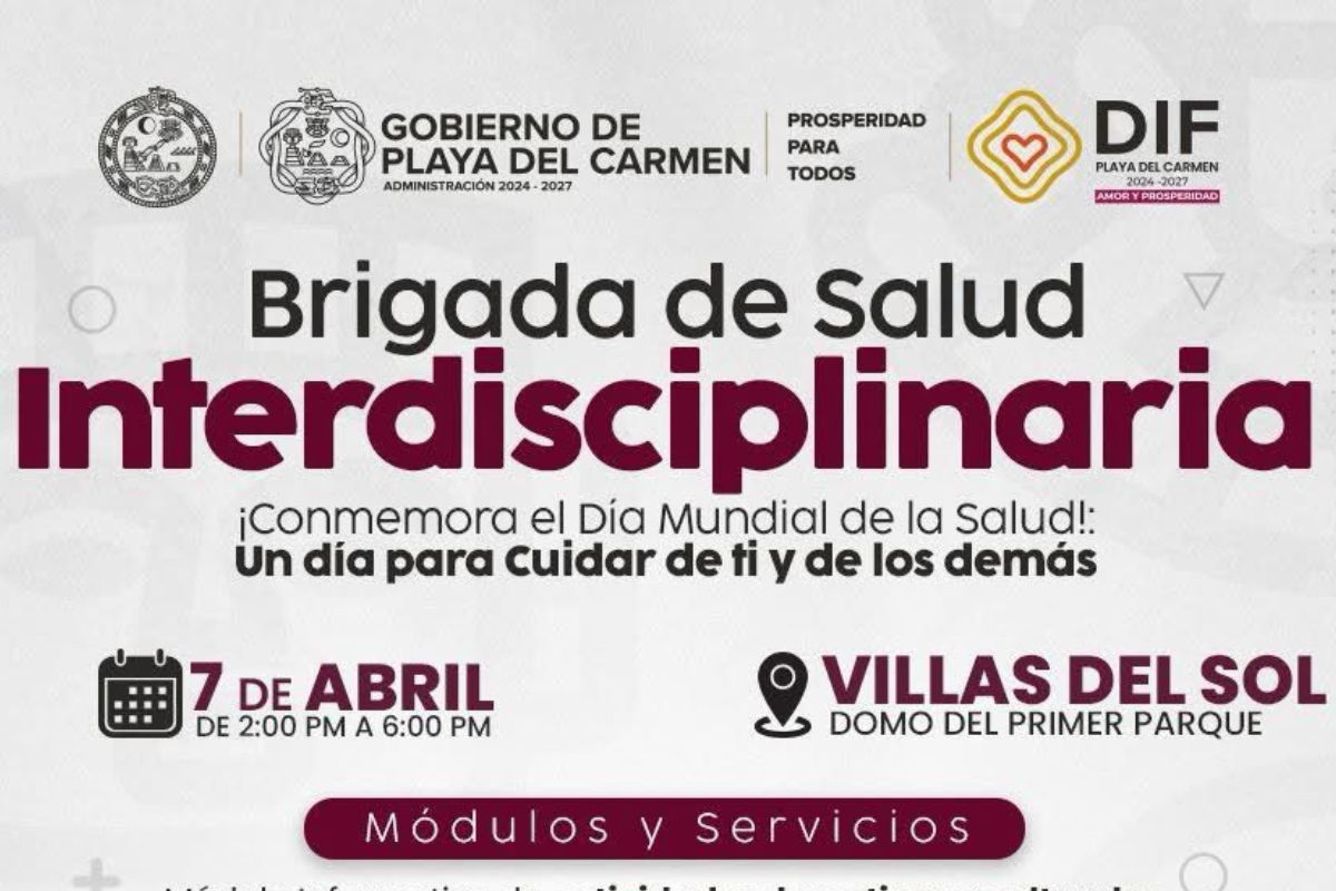 En el marco del Día Mundial de la Salud, el Sistema DIF Playa del Carmen, encabezado honoríficamente por Eduardo Ascencio y por instrucciones de la presidenta municipal Estefanía Mercado, invita a la comunidad a participar en la Brigada de Salud Interdisciplinaria, que se llevará a cabo este domingo 7 de abril, de 14:00 a 18:00 horas, en el domo del primer parque del fraccionamiento Villas del Sol.