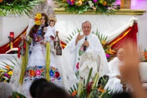 La presidenta municipal Estefanía Mercado, acompañada de su equipo de trabajo y vestida con el tradicional hipil, participó en la misa de bajada de la Virgen del Carmen, realizada en la iglesia de Nuestra Señora del Carmen. Esta ceremonia marcó el inicio de una de las celebraciones más significativas de la ciudad, que une a generaciones y refuerza el tejido social del municipio.