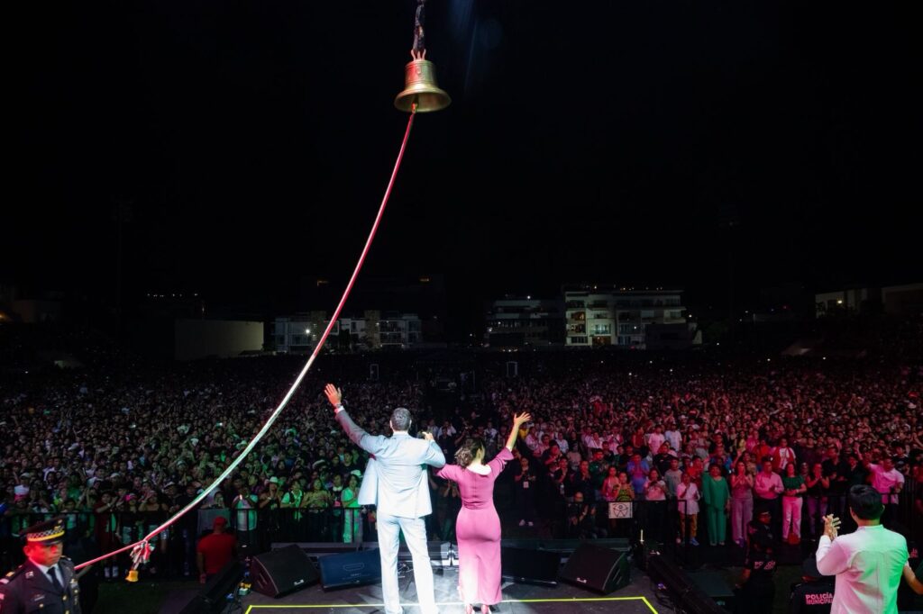 Desde un escenario vibrante, acompañada por el cabildo y la Señorita Independencia 2025, Lisset Ávila, Mercado pronunció con voz firme los vítores a los héroes de la Independencia, repicando la campana de Dolores y ondeando la bandera nacional.
