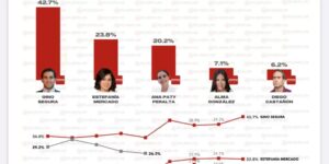El levantamiento, efectuado el 27 de octubre de 2025 por la empresa Rubruminfo S.A. de C.V., revela que Gino Segura encabeza las preferencias con 42.7 % de apoyo ciudadano, seguido de Estefanía Mercado con 23.8 %. En tercer lugar aparece Ana Paty Peralta con 20.2 %, mientras que Alma González y Diego Castañón registran 7.1 % y 6.2 %, respectivamente.