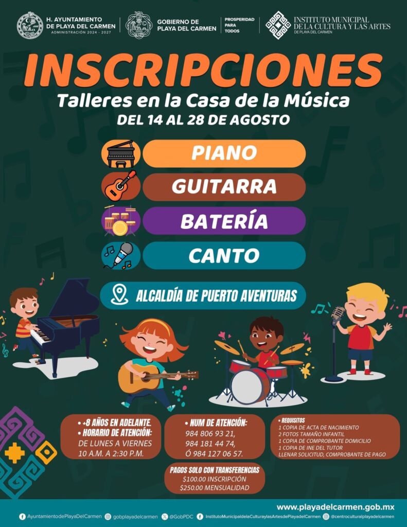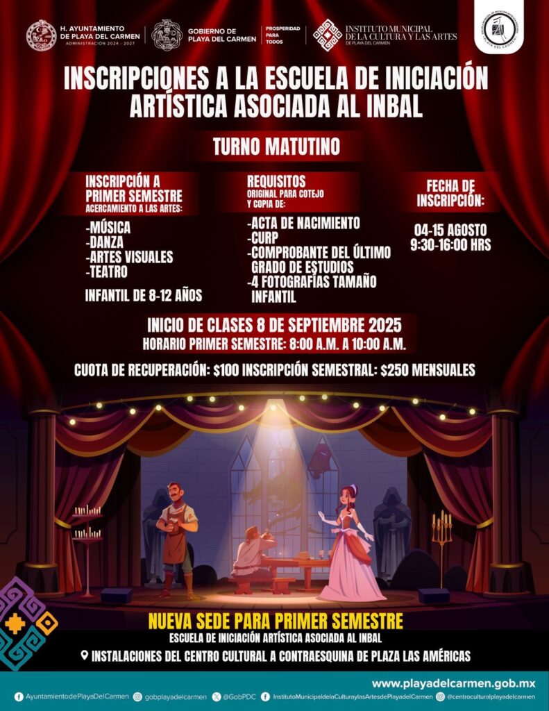 El Instituto Municipal de la Cultura y las Artes (IMCAS) de Playa del Carmen, bajo la dirección de Ernesto Santiago Martínez Cuéllar, anunció la apertura de inscripciones para el ciclo escolar 2025, con 48 talleres en la Escuela de Iniciación Artística asociada al Instituto Nacional de Bellas Artes y Literatura (INBAL) y plazas en la Orquesta Sinfónica Infantil y Juvenil. Esta oferta, alineada con las políticas culturales de la presidenta municipal Estefanía Mercado, busca fomentar el desarrollo artístico y fortalecer la identidad comunitaria.