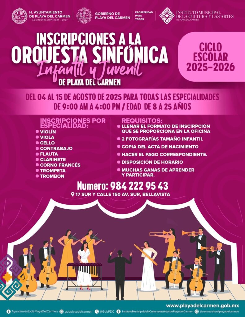 - Inscripciones: Contactar al 984-222-9543 para audiciones y requisitos, que incluyen demostrar competencia en un instrumento sinfónico.