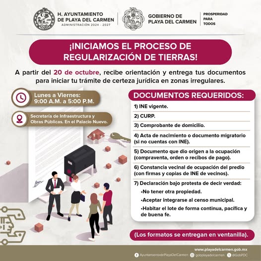 El Gobierno Municipal de Playa del Carmen anunció el inicio del proceso de regularización de tierras en zonas irregulares, una iniciativa que busca otorgar certeza jurídica a cientos de familias. A partir del 20 de octubre, los interesados podrán presentar sus documentos en la Secretaría de Infraestructura y Obra Pública, ubicada en el Palacio Nuevo, de lunes a viernes, entre 9 a.m. y 5 p.m. Este esfuerzo responde a la necesidad de ordenar el crecimiento urbano y promover la justicia social en el municipio.