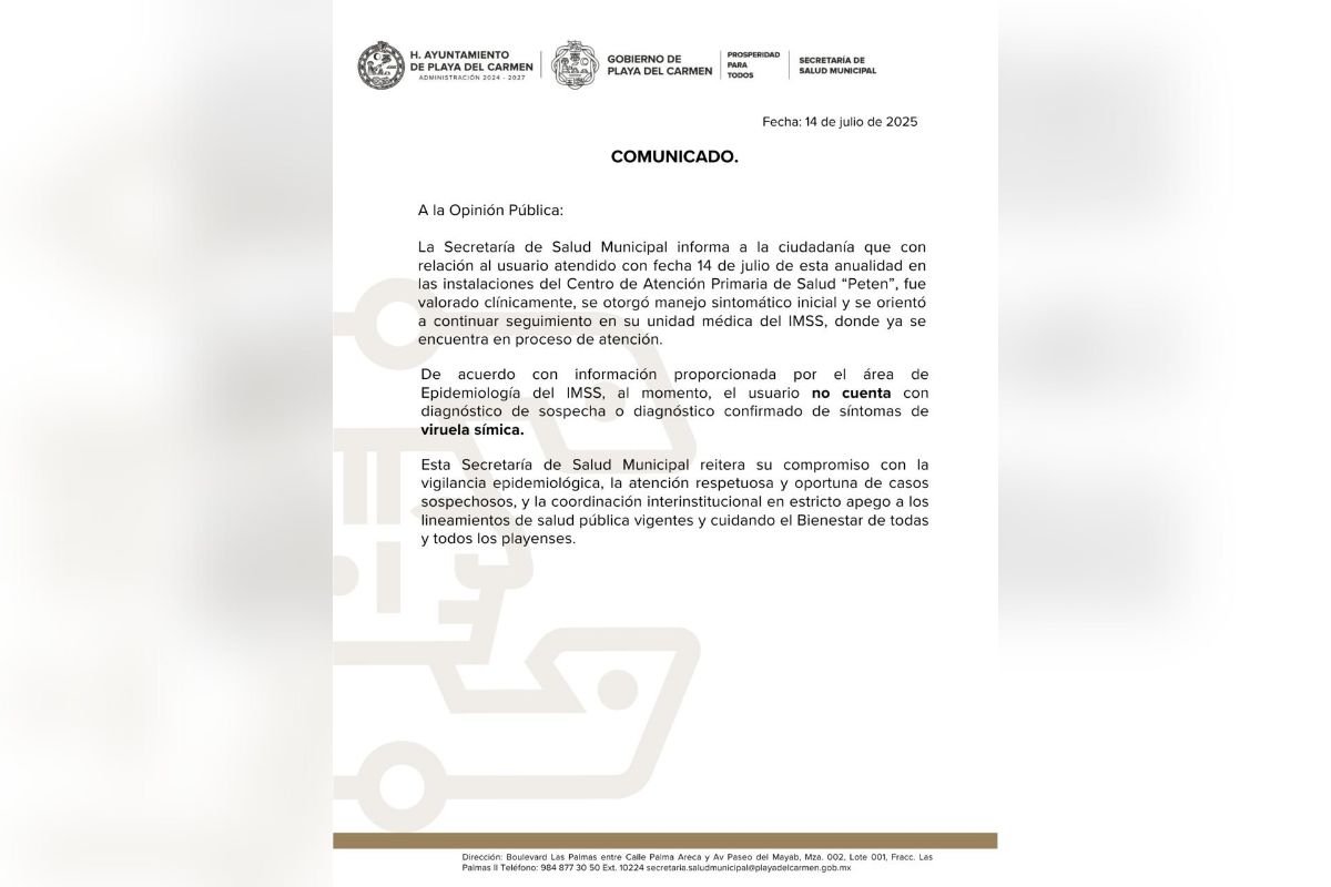 La Secretaría de Salud Municipal de Playa del Carmen informó que un usuario atendido el 14 de julio en el Centro de Atención Primaria de Salud “Peten” no presenta diagnóstico de viruela símica, ni sospechoso ni confirmado, según datos proporcionados por el área de Epidemiología del IMSS. El paciente, tras ser valorado clínicamente y recibir manejo sintomático inicial, fue referido a una unidad médica del IMSS para su atención continua.