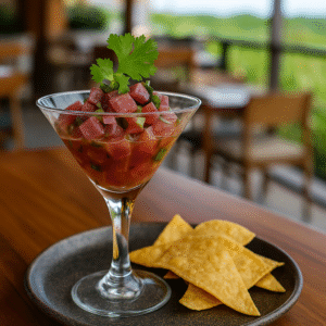 Uno de los platillos más aclamados de Bhanu Sky Kitchen es su ceviche de atún fresco, una preparación que destaca por su delicadeza y frescura. Servido en una copa de vidrio, el ceviche se acompaña de trozos de atún rojo marinado en jugos cítricos, cilantro fresco y un toque de chile habanero que le otorga un sabor ligeramente picante y refrescante. La combinación de sabores es perfecta para abrir el apetito, y su presentación, en un plato sofisticado y bien cuidado, invita a probarlo de inmediato.