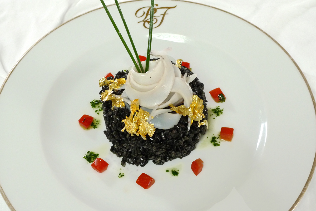 La receta es un secreto celosamente guardado. Combina ingredientes raros y exquisitos. El arroz Carnaroli, cultivado en una finca privada del valle del Po, se cuece lentamente. Se infusiona con trufas negras italianas, azafrán puro y caviar Beluga envejecido. Láminas finísimas de oro comestible se funden sobre el risotto. Perlas de esencia de langosta y aceite de trufa blanca añaden un toque final.