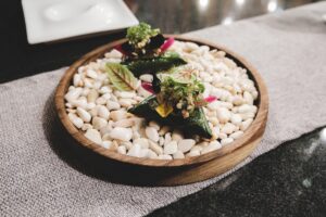 De entre las creaciones que integran su propuesta actual, destaca la Tetela de escamoles, presentada sobre piedras calientes. Este plato —de origen tradicional en Oaxaca— es reinterpretado con maestría por Gaytán: la masa de maíz es rellena con escamoles (considerados el “caviar mexicano”), quesillo artesanal y un toque de epazote, luego sellada y servida sobre un lecho de piedras volcánicas que conservan el calor.