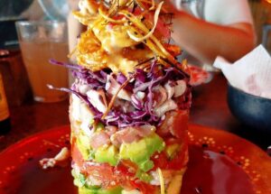 Entre las especialidades que destacan en Zitla Playa se encuentra la torre de mariscos, un plato que combina camarones, ostiones, pulpo, mejillones y pescado fresco, dispuesto de manera vertical y decorado con cítricos, hierbas y salsas caseras. Los comensales pueden acompañarla con limones frescos y una variedad de salsas picantes o suaves, según su preferencia. Esta preparación, visualmente impactante, ha sido señalada por visitantes como ideal para compartir y fotografiar antes de degustarla.