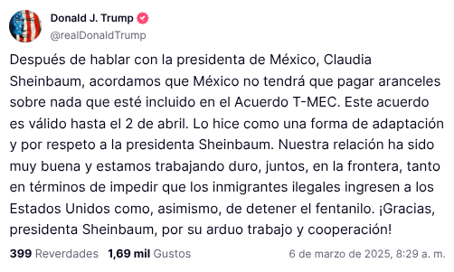 La presidenta de México, Claudia Sheinbaum, respondió agradeciendo la decisión de Trump. Señaló que durante su llamada, ambos coincidieron en que su colaboración ha dado resultados en áreas clave, respetando siempre las soberanías de cada país. Sheinbaum también explicó que, según lo acordado, los aranceles no se aplicarán a los productos dentro del T-MEC hasta el 2 de abril. Tras esa fecha, Estados Unidos anunciará aranceles recíprocos para todos los países involucrados.